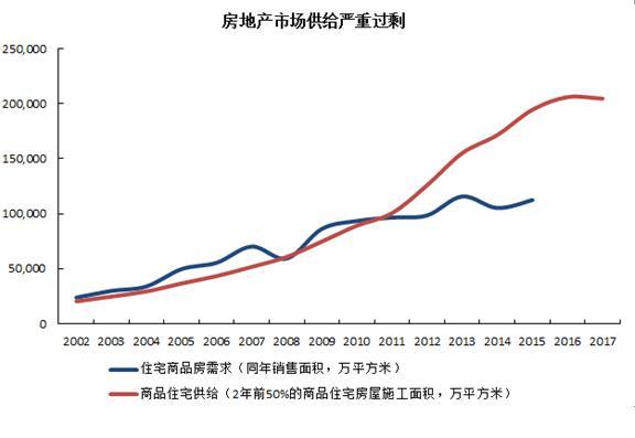 聽慣了各種房地產(chǎn)的故事,不妨看看直觀的數(shù)據(jù),最簡單的算法。房地產(chǎn)的需求當然是銷售面積,供給則可以大致等同于去年在建住宅面積的50%。 50%是因為考慮到中國期房銷售的傳統(tǒng)和建造速度較快的特點,隱含的假設了平均完工速度是2年。現(xiàn)實情況當然比這個復雜很多,但這個粗略的指標也可以勾勒出房地產(chǎn)市場的大體供需關系。可以看到自2012年以來,供給明顯開始大于需求,而這之前,基本是需求略大于供給的。按照這種方法測算,我們可以估計出直到2017年的供給,可以看到,供給不斷攀升。為什么房價還會在2012年以后瘋狂上漲?市場不是理性的,就和股票市場一樣,價格上漲不需要企業(yè)真的實現(xiàn)盈利。但缺乏基本面支持的上漲是難以為繼的。住宅市場的周期性比股票市場長很多。我們自98年開放地產(chǎn)市場后還未經(jīng)歷過真正的大周期。經(jīng)濟學沒法預測什么時候開跌,但可以肯定的是,供大于求的情況較為嚴重。當然,一線城市和全國的情況是兩回事情,這張圖可能更多的代表的是全國的供需。供需兩條線在長遠看是會聚和的,這種情況下結果只有兩個:供給線下降,意味著很多爛尾樓,銀行不良貸款;或者需求線上升,但考慮到人口拐點,需求上升的可能性不會很大。