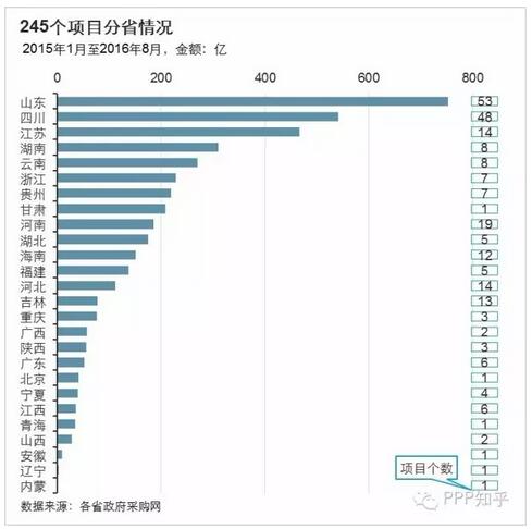 245個項目中有10個項目的規模信息不詳,為了方便計算和分析現將其規模金額記作0,由此可得總金額為4266億元,這些項目主要分布在以下省份中:
