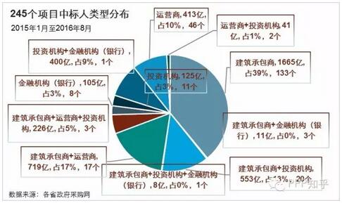 可以看出,在公布了回報率信息的245個項目中,類型為建筑承包商的企業參與率最高,不論是項目個數或是總中標金額都位列第1,其中建筑承包商單獨中標的項目總金額排名第1,,有1665億,占比39%,一共133個項目;金額數量排名第2的為建筑承包商與運營商的聯合體,中標17個項目共719億,占 17%;建筑承包商和投資機構的聯合體排名第3,總金額為553億,共20個項目。2015年到2016年中金融機構參與的PPP項目共有20個,其中有 13個項目的回報條件中規定了投資回報率,可以看出,金融機構在項目的選擇中比較在意回報條件中的投資回報率。