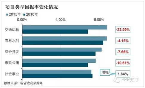 從上圖中不同項目類型的回報率情況來看,社會事業與其他類項目回報率有小規模增長外,農林水利與環境保護、交通運輸、綜合開發、市政公用事業四種不同類型項目的回報率從2015年到2016年均有一定的下浮。