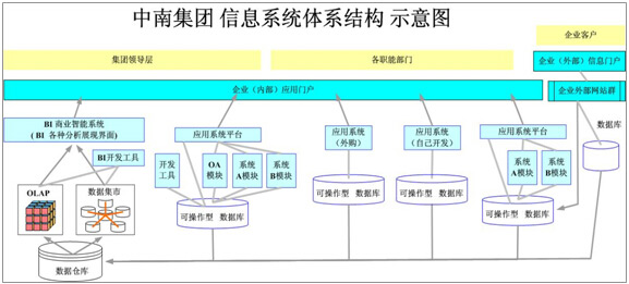 信息系統架構。企業門戶(Portal)是一種基于WEB層的,將不同應用、業務過程、后端系統、服務和信息等內容集成到一個窗口中的系統平臺。中南集團的企業門戶按照應用領域,分為:企業應用門戶和企業信息門戶。以開放的“企業應用門戶”作為各種軟件應用系統的整合平臺;以統一的“企業信息門戶”連接著集團各種外部網站,作為展示企業形象的窗口和獲取外部訪問者信息的接口;以具有各種管理流程的“軟件應用系統”作為數據的提取平臺;以“數據倉庫”和“BI商業智能系統”作為數據匯總和分析的工具,它們共同構成了中南集團的“信息系統體系結構”,達成了一個以集團總部為核心,輻射各子公司、分公司、項目部的集團信息系統,見圖1。