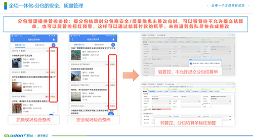 而企項一體化可以改善這種現象,施工企業可以根據自身的管控要求設置一個管控參數,那么在提分包結算的時候,如果分包商的安全質量隱患未整改完,可以實行強管控,不允許其提交結算單,也可以實行若管控,對其進行標紅預警。這樣就對安全質量的隱患整改提供了一個管控抓手,極大地提高勞務隊的整改效率。