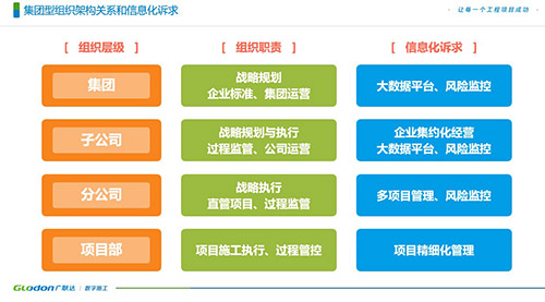 針對一個集團型組織架構的施工企業來說,不同的組織層級所承擔的組織職責是不同的,因此各組織層級的信息化訴求也是不同的。項目部的職責是項目施工執行、過程管控,其信息化訴求是項目精細化管理;分公司的組織職責是直管項目,對項目做過程監管,其信息化訴求是實現多項目管理,以及風險管控;子公司一方面要承接集團的戰略規劃與執行,同時,還要做自己公司和項目的過程監管,以及公司的運營工作,因此,子公司的信息化訴求是企業集約化經營,以及建立大數據平臺,實行風險監控;那么對頂層的集團組織層級來說,其組織職責是要做戰略規劃,制定企業標準,以及負責集團的整體運營,因此,集團組織層的信息化訴求是要搭建大數據平臺,以及實現過程的風險監控。