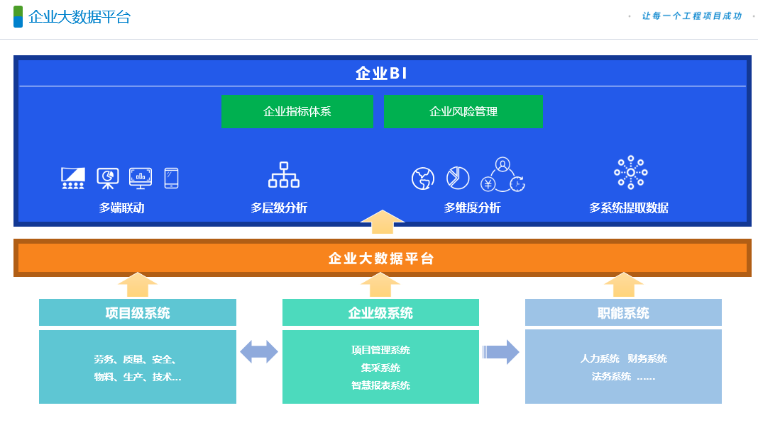 企業數據平臺實現了業務層數據的橫向打通以提升各業務之間的協作效率,同時實現了數據展現層的豎向打通提升管理效率,實現企業的智慧決策。現在重點、大型項目都已經應用了BIM+智慧工地平臺,平臺通過項目智慧大腦的方式,把項目上的所有數據歸集到一個可視化平臺上進行展示。基于一個平臺,N個應用的整體系統架構,施工企業可以根據自身的管理需要分別上線各個業務板塊系統,而企項一體化可以實現兩個層面的數據打通:業務層的橫向數據打通和數據展現層的豎向數據打通。業務層的橫向數據打通也就是物料驗收系統的地磅單和項目管理系統的到貨點驗單,質量、安全數據和分包結算單等業務層數據的打通,同時,業務層面數據的橫向打通是面向操作層用戶的,可以避免數據的重復錄入,提高人員的工作效率,并且保持數據的一致性和真實性。數據展現層的豎向打通能夠跨部門把所有的業務數據都統一歸集到企業大數據平臺中,能夠自動抓取企業級和業務級各個業務系統的數據,通過多維圖表方式展現,用真實、及時的各個業務數據說話為企業賦能,數據的豎向打通是面向管理者的,用來提升管理效率,最終用數據創造價值,實現企業的智慧決策。