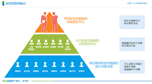 施工企業中,對于不同的管理層級,同時又面臨不同的業務和管理痛點。項目現場是業務數據的核心采集來源,而項目層級又面臨手工采集工作量大、數據不準確(公司上一套系統,項目上就為了填報而填報,項目人員苦不堪言)、各部門橫向數據不交圈(成本核算的時候,經常是預算人員追著各業務部門去要數據)等痛點;公司層是業務數據的過程管控中心,其痛點就是數據橫向和縱向不交圈,橫向各個部門之間,縱向公司和項目之間的數據不交圈,無法看到關聯數據,也看不到整體情況;集團是業務數據的風險管控中心,其痛點是看不到下級單位的數據,缺少數字化手段來有效實行風險管控。