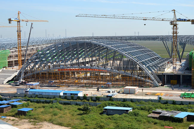 河北奧林匹克體育中心體育館綜合體鋼結構工程包括體育館、綜合訓練館及網(wǎng)球中心、游泳館三部分,主要為空間網(wǎng)架+單層拱殼混合型結構體系。總用鋼量約5100噸,歷時80天安裝完成。