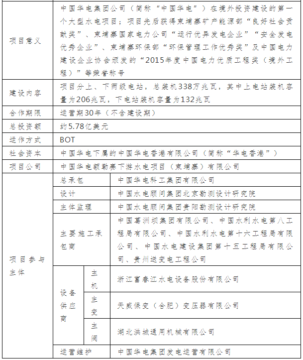 柬埔寨額勒賽下游水電項目位于柬埔寨國公省額勒賽河下游,是柬埔寨已投產裝機容量最大的水電站,分上、下兩級,共安裝四臺水輪發電機組,總裝機2×103+2×66=338MW,年發電量約11.98億kWh,總投資約5.78億美元。