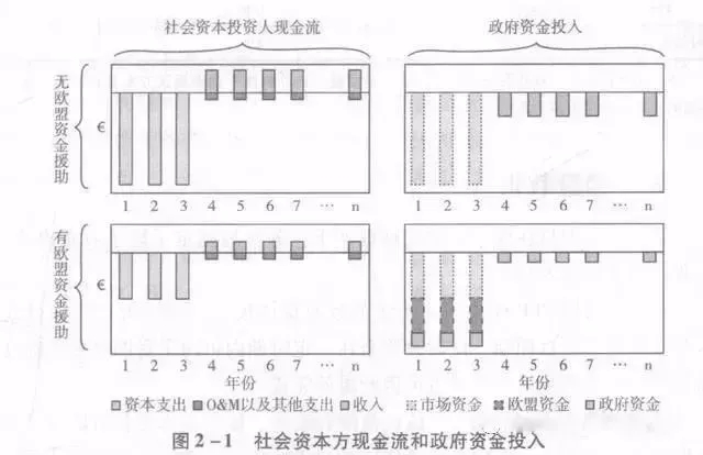 圖2-1展示了建設(shè)期內(nèi),在有/無歐盟資金援助情況下的社會資本方現(xiàn)金流和政府資金投人。
