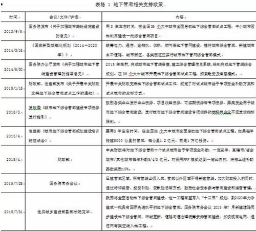 隨著中國新型城鎮化的推進,過去城市建設只重地上、不重地下的弊端逐漸暴露出來,現有管道老化嚴重,城市內澇問題頻發。2013年9月,國務院發布《關于加強城市基礎設施建設的意見》,要求用3年左右時間,在全國36個大中城市全面啟動地下綜合管廊試點工程;中小城市因地制宜建設一批綜合管廊項目。隨后政府出臺多項文件,集中力量支持我國地下綜合管廊建設。