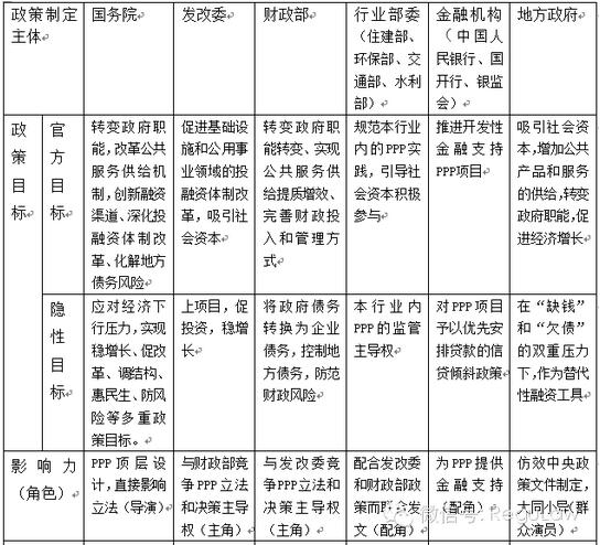 法律常常是特定政策目標(biāo)與政策內(nèi)容的體現(xiàn)和載體,政府的重大政策亦常成為立法的直接驅(qū)動力。有的法政策學(xué)者甚至認(rèn)為“最好的法律是能順利達(dá)成政策目的的法律。”[14]換言之,在某種程度上,法律是實現(xiàn)特定政策目標(biāo)的工具。因此,在PPP立法之前我們應(yīng)當(dāng)首先對PPP政策的主要制定主體、政策目標(biāo)以及制定主體對總體PPP政策的影響力等方面進(jìn)行剖析。
