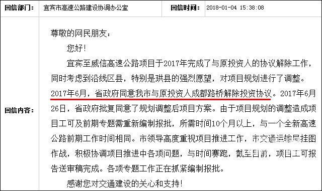 早在2014年,成都路橋就已中標宜威高速公路四川境段BOT(建設-經(jīng)營-移交)項目。當時的消息稱,該項目預計總投資82億元,計劃施工工期為4年。掐指一算,現(xiàn)在已經(jīng)2018年了,項目進展如何了呢? 近日,已有熱心網(wǎng)友在宜賓《市長與網(wǎng)民》信箱咨詢,留言如下——