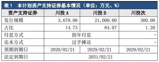 川投PPP-ABS項目基礎資產為資陽市雁江區停車場PPP項目經營權及收益權,由四川省投資集團有限責任公司作為原始權益人,資產服務機構為四川省川投航信股權投資基金管理有限公司,中航信托作為川投航信的主要發起人與股東之一,在中國工商銀行四川省分行的支持下發行與設立。項目總規模2.4979億元,其中優先A檔3679萬元,占比14.73%,2020年2月21日到期;優先B檔2.1億元,占比84.07%,2029年2月21日到期;次級檔300萬元,占比1.2%,無評級。