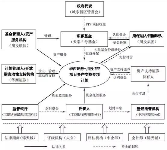 交易結構方面,基金交易結構層面,川投航信作為基金管理人發起設立契約式私募基金“川投航信天泰2號私募投資基金”,川投航信作為社會資本方代表私募基金與政府簽訂PPP項目合同;基金出資受讓PPP項目特許經營權及相應收益權,由政府授權TOT方式轉讓給川投航信。PPP運營期內,川投基金或其設立的PPP項目公司通過向停車場用戶收費回收投資并獲取合理回報,不足部分由政府提供可行性缺口補助。專項計劃層面,計劃管理人與原始權益人川投集團簽訂《基礎資產買賣協議》,將專項計劃募集資金用于向原始權益人購買基礎資產,即原始權益人根據基金合同持有的天泰2號基金份額。天泰2號基金用于購買資陽市雁江區停車場PPP項目經營權,并以此獲取收益。