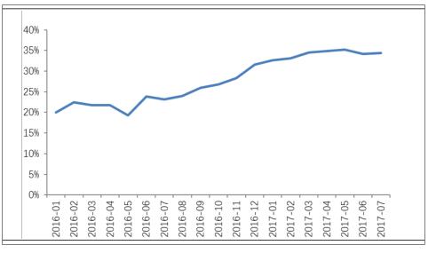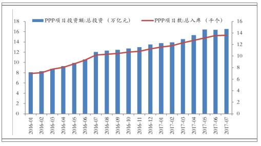 根據全國PPP項目庫統計數據,截至2017年7月末,全國入庫項目投資額高達16.54萬億元,同比大幅增長37.49%,共計13599個;項目落地率34.40%,比上月提升0.2個百分點。