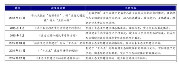 隨著政府大力推行生態文明建設,生態文明頂層設計逐步完善,生態環保法制建設不斷健全。2015年4月,中共中央、國務院印發《關于加快推進生態文明建設的意見》,明確了生態文明建設的總體要求、目標愿景、重點任務和制度體系。2015年9月,《生態文明體制改革總體方案》出臺,提出健全自然資源資產產權制度、建立國土空間開發保護制度、完善生態文明績效評價考核和責任追究制度等制度。近兩年連續出臺的《新環境保護法》、《大氣污染防治行動計劃》、《水污染防治行動計劃》和《土壤污染防治行動計劃》將生態文明建設不斷由概念向具體操作領域深入落實。