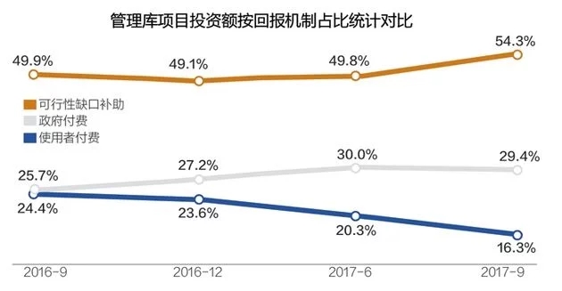 根據財政部全國PPP綜合信息平臺項目庫第8期季報披露的情況,如果按回報機制來進行統計,在管理庫的項目總數當中,截至2017年第三季度末,有39.5%屬于政府付費項目,如果算上政府市場混合付費的“可行性缺口補助類”項目,占比達到近80%,而且從2016年以來這一比例呈逐季提升之勢;而如果按管理庫項目的投資額來統計,政府付費項目和可行性缺口補助類項目的占比則已經超過了80%,其占比同樣也是逐季上升。
