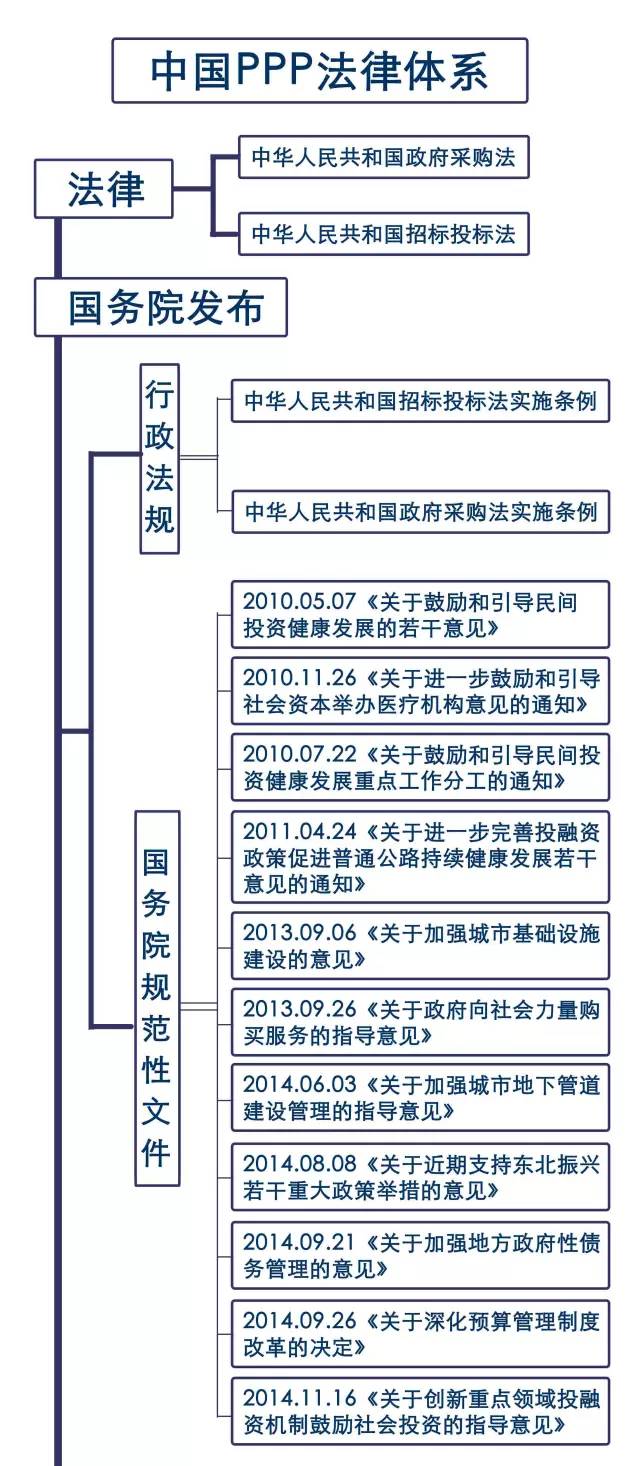 首先,來看全國層面的PPP相關法律。這部分涉及到出自全國人大的法律、出自國務院的行政法規、國務院部門規章及規范性文件。