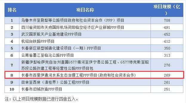 1月18日,明樹數據發布了《2017年中國PPP發展年度報告》,報告中對2017年單體項目投資規模進行了排名,其中涉及環保項目1個,長春市百里伊通河水系生態治理工程PPP項目位居第八位。我們看看2017年項目規模最大的10個PPP項目有哪些:
