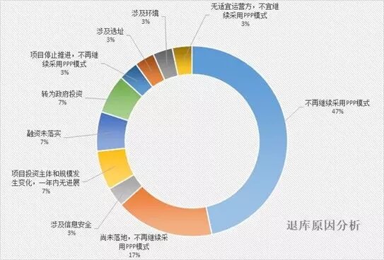 根據山西萬方建設工程項目管理咨詢有限公司提供的分析圖片,退庫原因總體上“不再采用PPP模式”的占47%,“尚未落地、不再繼續采取PPP模式的”占17%,此外還包括“融資未落實”(7%)、“項目投資主體和規模發生變化,一年內無進展”等原因。