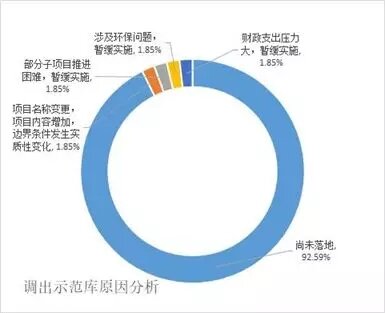 (2)調出示范但保留在庫。將尚未完成社會資本方采購或項目實施發生重大變化的北京市豐臺區河西第三水廠等54個項目,調出示范項目名單,保留在項目庫,繼續采用PPP模式實施。調出示范的原因中,“尚未落地”占92.6%,其他則包括“財政支出壓力大”“涉及環保問題”“部分子項目推進困難”“項目名稱、內容及邊界條件發生實質性變化”等。