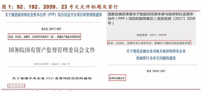 從文件標題及首行可以看到,92號文、192號文、2059號文對應的約束對象分別是各級政府、中央企業、各級政府,而23號文的約束對象是各級金融企業(即圖1右下圖片)。這是23號文與此前三個文件最大的不同點所在。