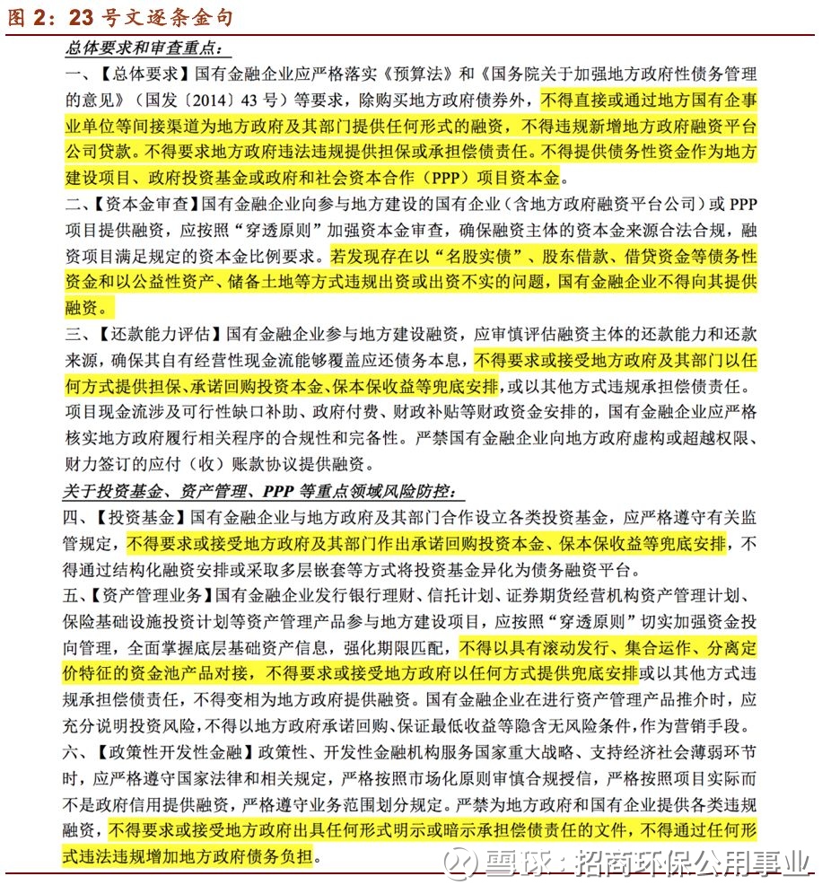 從23號文的正文來看,在17條要求中,幾乎每一條都能看到對“名股實債”或“兜底安排”的限制,23號文就是在從總體要求、資本金審查、還款能力評估等金融企業參與實體投資的各個階段對地方政府及國有企業“名股實債”行為進行限制。這是23號文內容的核心。