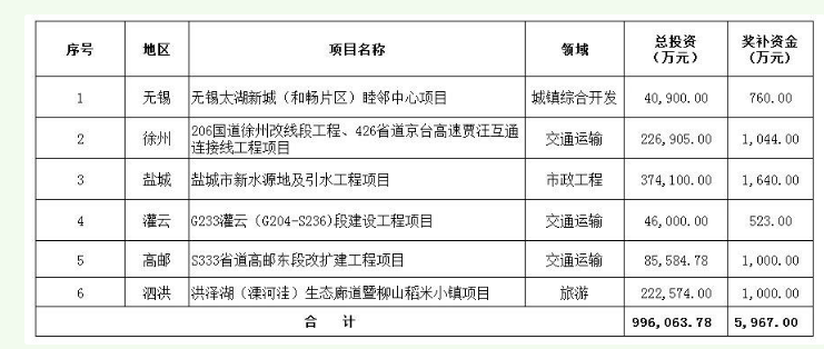 ◆江蘇省財政廳下達2018年第一批PPP項目獎補資金。經研究決定,對符合條件的6個已落地省以上試點項目給予獎補,獎補資金總額5967萬元。