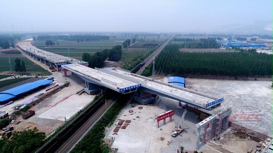 據(jù)十四局三公司京秦高速項目經(jīng)理孔德芒介紹,京哈鐵路是北京通往東北最重要的鐵路通道,每7分鐘便有一趟列車通過,為保證京哈鐵路的正常安全運營,建設者克服施工作業(yè)面小、列車過往頻繁、有效施工時間短等影響因素,在京哈鐵路兩側(cè)用支架法分別澆筑2個長122米、重10400噸的箱梁,同步逆時針旋轉(zhuǎn)52.5度,兩個轉(zhuǎn)體橋最小間距僅為1米,成功實現(xiàn)雙幅跨越京哈鐵路。