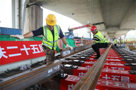 中鐵二十五局施工人員指揮吊機進行鋼軌鋪設(shè)