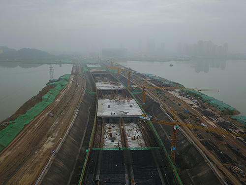 在銀川管廊項目的施工現場閱海湖被圍堰分成兩部分,只在一側與湖岸留有60米的距離作為湖水導流段道。在兩側土圍堰的中間,約7000根6米長的拉森鋼板樁連成千米鋼墻,用震動沉樁機打入湖底不透水層2米,形成一道堅固的壁壘。圍堰圈出的長龍就是銀川湖底隧道管廊的施工現場。