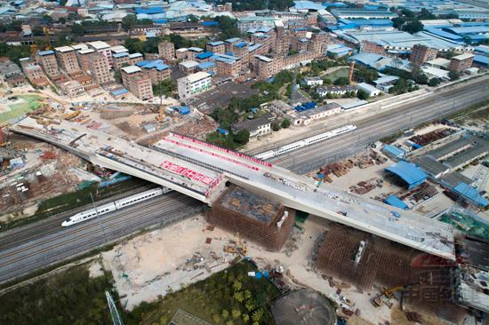 11月7日凌晨,由中鐵二十五局四公司承建的南寧亭洪路延長線上跨鐵路立交橋右幅成功轉體110度,與此前完成120度轉體的左幅主橋順利“合體”,成功刷新了國內跨高鐵橋梁轉體角度、國內最小曲線半徑轉體2項新紀錄,為年底亭洪路延長線建成通車掃除最后障礙。