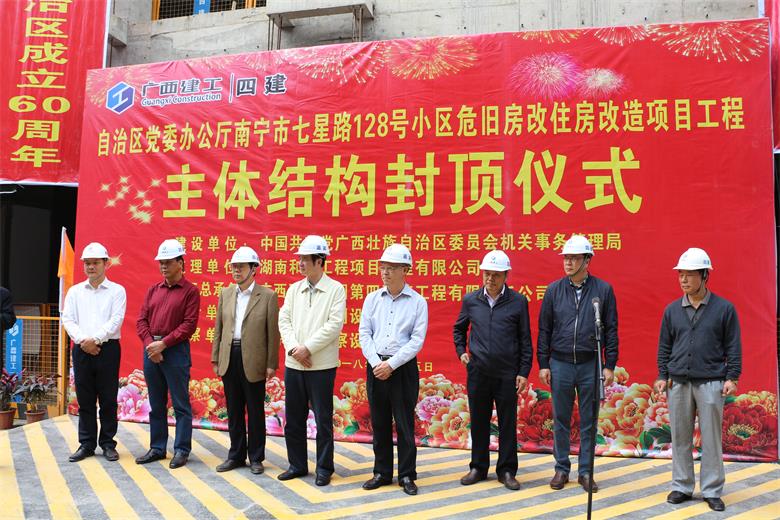 上午10點,廣西壯族自治區黨委辦公廳七星路128號危舊房改住房項目舉行封頂儀式。廣西壯族自治區黨委常委,黨委秘書長、辦公廳主任、直屬機關工作委員會書記(兼)黃偉京,黨委副秘書長、辦公廳副主任、巡視員蔣洪,廣西建工集團黨委副書記、總經理、副董事長羅濤,廣西建工四建黨委書記、董事長楊俊出席封頂儀式。各方對該項目提前45天封頂表示高度贊賞。該工程總建筑面積65430.61 m2,地上建筑面積55736.07 m2,地下室車庫建筑面積9694.54 m2,建筑占地面積2956.02 m2;建筑層數為地上32層,地下2層,建筑高度99.85米。
