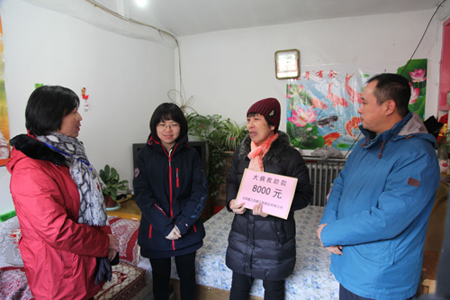 12月7日,懷柔區紅十字會特邀捐贈企業北京建工集團四建公司慰問該區困難家庭,監督愛心捐款使用情況。這次邀請捐贈企業共同入戶慰問是懷柔區紅十字會首次開展,使企業既增加了紅十字會對善款使用情況的透明度,也增強了捐贈企業積極履行社會責任,營造了崇德向善的良好社會氛圍。 這次接受捐贈的懷柔鎮劉某身患急性髓系白血病,治療費用達32萬元,雖有好轉,仍在治療中,家庭陷入困境。在區紅十字會常務副會長吳秋紅的引領下,四建公司總經理李化等領導深入到劉某家中,噓寒問暖,送去8000元慰問金和慰問品,李化叮囑患者保重身體,鼓勵他們全家積極面對生活,一切會好起來的。