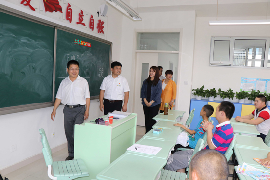 隨后在特教中心老師的引導下大家參觀了學校教室、康復室、學生宿舍、報告廳等地,進一步了解了學生們的生活學習狀況,并在教室中和孩子們一起唱歌、做眼保健操。