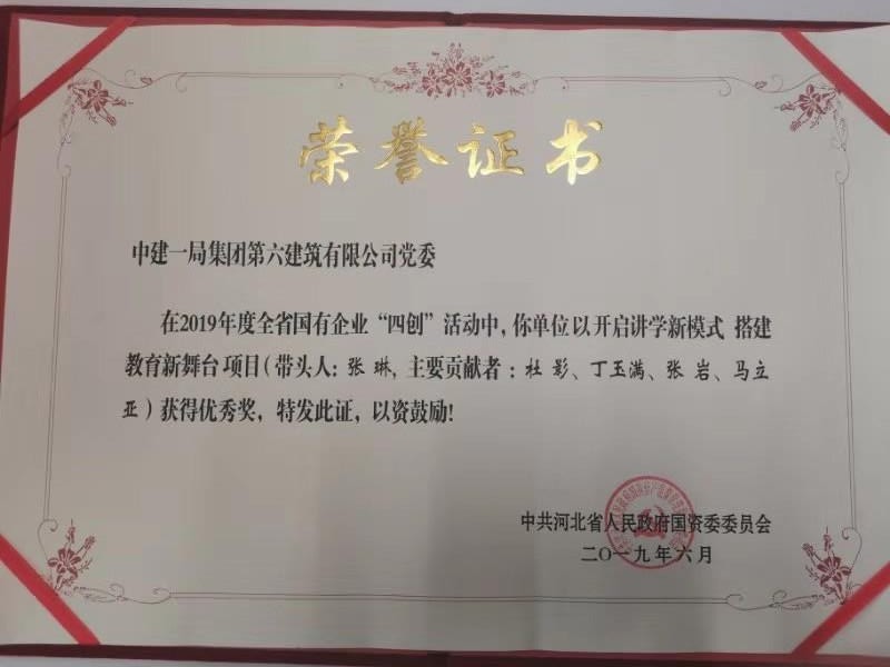 近日,中建一局六公司黨委收到了河北省國資委黨委關于2019年度全省國有企業“四創”活動的表彰文件、證書及獎杯,公司“開啟講學新模式 搭建教育新舞臺”項目獲得優秀獎。