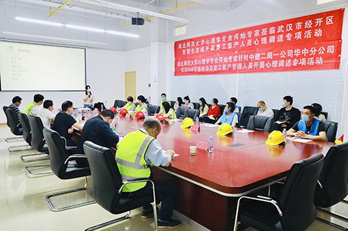 因為考慮在疫情期間可能會給職工帶來心理困擾,該項目與武漢市經濟技術開發區智慧生態城管理辦公室聯合開展了“員工心理調適專項會”活動,邀請湖北師范大學心理學老師走進工地課堂,就疫情帶來的心理問題、情緒調節、非暴力溝通以及壓力應對四方面,為大家進行現場講解,并開展“一對一”心理輔導,以幫助項目職工和工友們能夠積極投入到工作和生活中。心理調適課后,項目部還為全體職工及工友精心準備了水果、生活日用品等五一勞動節慰問品,并致以節日慰問和祝福。