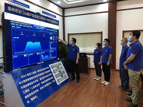 中鐵北京工程局潘志平和項(xiàng)目管理人員通過(guò)數(shù)據(jù)平臺(tái)查看施工人員動(dòng)態(tài)、現(xiàn)場(chǎng)質(zhì)量問(wèn)題分析 周莉/攝