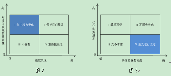 對現行流程的綜合性評判從三個緯度展開,一是流程對業務發展的重要性;二是流程在運行過程中的績效表現;三是流程改進實施成本的高低。首先,根據流程的重要性和績效表現,確定本年度內部流程優化的關注重點(如圖2);其次,根據關注的重要程度和流程優化的實施成本,確定流程優化的先后順序(如圖3)。