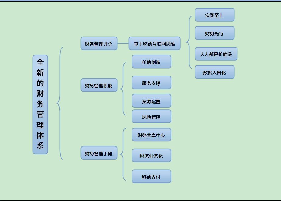 全新的財務管理理念。實踐至上。逢大勢不踐小諾,處大事不拘小禮。移動互聯網時代的瞬息萬變對財務管理的因勢利導、變革創新能力提出了更高的要求。在底線、紅線、高壓線之外,財務管理還有更大的創新空間,在許多領域可以進行嘗試,而不能過多拘泥于條條框框。