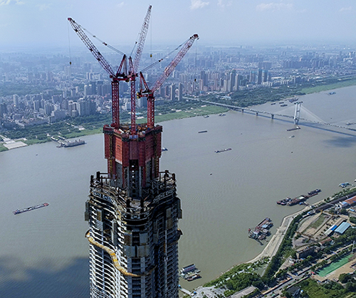 2012年,在時為華中第一高樓、高438米的武漢中心項目,第三代頂模——微凸支點智能控制頂升模架首次應用,最大高度27.8米,豎向橫跨3個半結構層,實現鋼筋綁扎層、混凝土澆筑層、混凝土養護層分層流水施工;長35米、寬35米的頂部平臺提供充足的施工空間和材料、機械設備堆場;并專門研發智能綜合監控系統,頂模體系的運行安全得到有效保障。頂升液壓系統的推力也大幅提升至2400噸,可以將3萬名成年人同時頂起。第三代頂模先后運用于武漢中心、深圳華潤總部大廈。