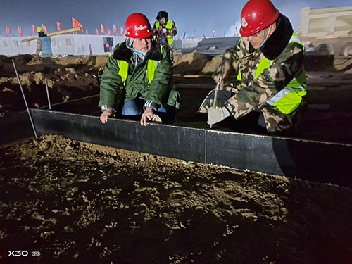 九分公司支部書記、經(jīng)理李占武領(lǐng)命了新增的390間隔離房和醫(yī)護人員辦公和生活區(qū)的施工任務(wù)。他在同時管好石家莊市其它項目的同時,帶領(lǐng)分公司副經(jīng)理辛超、何健,克服材料人員籌備難、基礎(chǔ)布局復(fù)雜等不利因素,連續(xù)堅守現(xiàn)場五天,在風(fēng)力最大8級的那個夜晚完成了墊層澆筑工作,當(dāng)時氣溫零下16度。凍感冒了堅持干、嗓子啞了就手比劃,李占武經(jīng)理說:“九分公司全員一呼百應(yīng),快速到場進入狀態(tài),不推不靠,積極行動真的讓人很感動。”出發(fā)前他們在司旗上鄭重地簽上了自己的名字。
