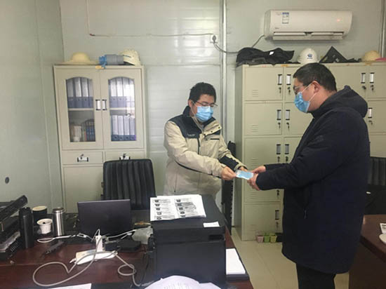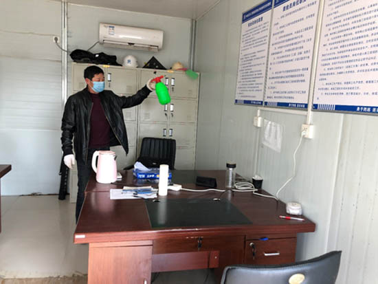 三是堅決執行防控措施,筑牢“消殺防線”。在項目部辦公區域定時定人多次對員工宿舍、辦公室、食堂等公共區域采用84消毒液以及酒精進行消毒;為每位員工發放體溫計、口罩,對員工每天實行溫度統計;對返崗人員進行單獨隔離觀察并登記,車輛外出返回時進行內外消毒,確保員工擁有安全的工作環境。